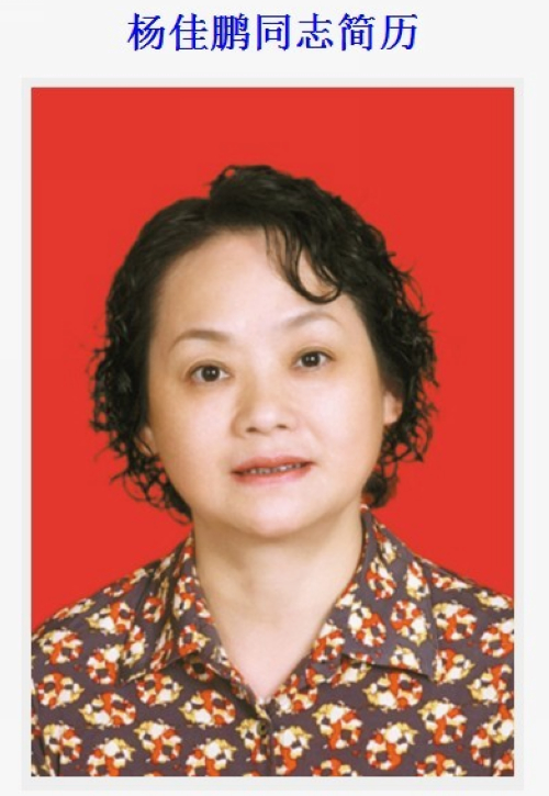 杨佳鹏,女,汉族,1954年12月生,四川大竹人,无党派人士,1972年3月参加工作,四川省委党校函授行政管理专业毕业,大学学历。