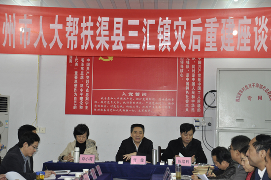 座谈会上,在听取了三汇镇、渠县相关部门的灾情、灾后重建情况汇报,并观看了9.18洪灾纪录片后,胥主任提出了意见和建议。胥主任动情的说,看了洪灾现场,我和大家一样,心情十分沉重,在此对灾民表示诚挚地慰问;渠县三汇镇的抗灾救灾工作行动快,重建工作抓得扎实,干部群众精神面貌好,大灾面前不退缩,不等不靠,生产自救充满干劲。胥主任指出,灾后重建是三汇镇当前的中心工作,重建工作要做到以下几点:一是规划要先行。三汇镇灾后重建要与新农村综合体建设相结合,通过高品位规划、设计,高起点建设,达到重建点基础设施综合配套齐全、服务功能完善的要求,实现省委市委建成非地震灾区灾后重建示范区的目标;重建选址要科学,要有避灾意识,杜绝在洪水线以下及地质灾害易发区新建项目;在恢复重建中,要实行“统规自建”,千方百计调动老百姓的积极性,重建户型要选好。市住建局要派出规划设计工作组入驻灾区,提供技术支持,大力发扬自力更生精神,重建美好家园。二是民生要保障。在今冬明春,当地政府要确保灾区群众有饭吃、有衣穿、有水喝、有房住、有医疗,保证灾民安全过冬,顺利渡过明年的春荒,不能出现冻倒、饿倒一个灾民的现象,确保灾区安全稳定。三是生产自救要早行。当前是秋冬之交,要调动老百姓的生产积极性,抓好见效快的冬菜和小春种植,并把这项工作当作灾后生产自救的重要举措来抓。四是基础设施恢复要快。灾区的重建,基础设施的恢复是首要的工作,比如交通、水利。市交通局要派出以副局长带队的工作组开展实地调研,研究如何尽快恢复水毁桥梁,保障灾区的交通运输,为灾后重建提供良好条件。市水务局要帮助解决场镇饮水和新农村综合体供水问题,要搞好规划设计,新修饮水工程要做到科学避灾。最后,胥主任要求市各级部门要进一步加强对洪灾灾区的联系指导,尽量为灾后重建工作创造条件,帮助灾民早日实现重建美好家园的愿望。