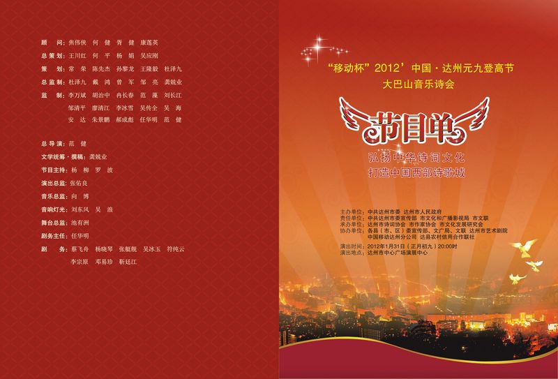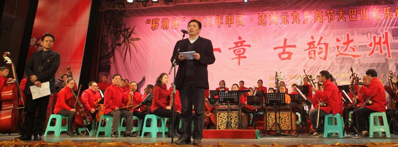 【文字报道选自达州网 】龙腾盛世千家喜,春满神州万象新。作为2012中国•达州元九登高节重要活动之一的大巴山音乐诗会昨(31日)晚在达城中心广场演艺大厅浓情上演。市人大常委会主任、市诗词协会名誉主席胥健观看晚会并致辞。