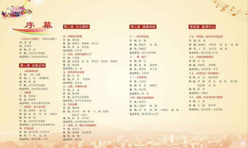 整场音乐诗会以“赞美秀丽山川,拥抱美好生活”为主题;共分为古韵达州、元九唱和、情满诗城、春涌巴山四个篇章。音乐诗会在由胥健作词、雷登荣作曲的诗会主题歌《大巴山上诗相会》中拉开序幕。由达州市诗词协会选送的《元稹通州诗词》、宣汉县选送的《花月春风诗意浓》;由渠县选送,表现该县党员干部群众奋力抗击2011年9•18洪灾,稳步推进灾后重建,加快创建四川省非地震灾区重建示范县壮丽诗篇的《宕渠壮歌》;由通川区第八小学选送,描写凤凰山秀美风光,春意盎然的《凤凰山,绽放春天的意向》等诗词,以广视角,多层面,全方位展现了达州人民深入贯彻党的十七届六中全会精神,推动文化大发展大繁荣,建设川渝鄂陕结合部区域文化中心城市,实现科学发展、建设幸福达州而努力奋斗的豪情壮志。