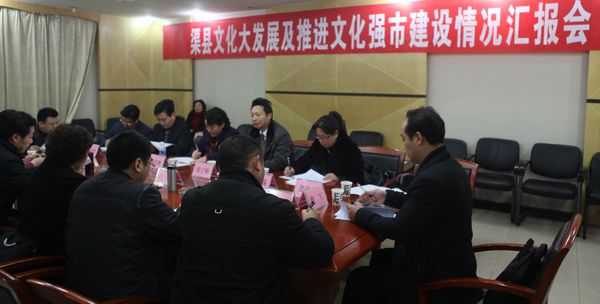 实地察看结束后,在县政府402会议室听取了渠县文化发展及推进文化强县建设的情况汇报。会上,吕芸副县长就渠县文化元素及特色品牌基本情况、文化发展现状、繁荣文化发展的政策措施、文化体制改革及投入情况、文化发展“十二五”规划制定落实等全县文化发展及推进文化强县建设情况作了全面详实的汇报,表示我县今后一个时期,将紧紧围绕文化大发展、推进文化强市建设,大力实施好“123456”文化工程。围绕社会主义核心价值体系建设,显著提高人民群众思想道德素质。推出20项在市以上产生重大影响的文艺精品,培养30名在市以上有重大影响的文化领军人物和拔尖人才,优秀人才脱颖而出的体制机制更加完善。着力打造4项以上体现渠县特色的文化品牌,建成5大文化产业带,文化管理体制和文化产品生产经营机制更加灵活。努力建成六大公共文化标志性工程,公共文化服务体系不断健全,渠县文化“走出去”成效明显,对经济社会发展的贡献率明显提高,文化发展主要指标和文化综合实力位居川东前列。刘荣忠局长对渠县正在规划和打造的5大文化产业带、特色文化活动开展等情况做了补充汇报。