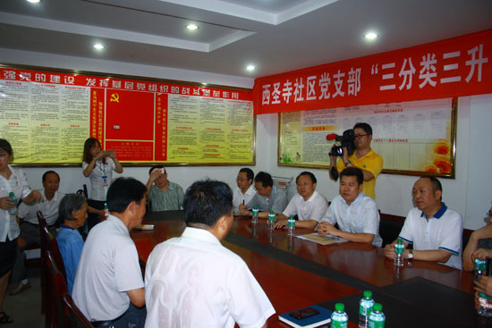 在西圣寺社区会议室,邹惠明副主任一行同通川区人大、政府负责人和社区的部分干部群众进行了座谈,听取了社区经济社会发展情况及当前存在的主要困难和问题,邹主任充分肯定了近年来西圣寺社区在通川区各级组织指导下充分发挥党组织服务民生、构建和谐的作用,创新社区管理网络化、自治管理民主化、爱心服务网络化的“三化合一”模式取得的可喜成绩,对他们提出的征地拆迁、建养老院资金短缺等困难和问题表示将想办法协调解决。他指出:今年是基层组织建设年,希望西圣寺社区要围绕“抓学习、强组织、建阵地、增活力、促公开”的工作思路,大力构筑“爱心党建”,不断推进社区党的建设;要进一步做好社区创建的“爱心通”管理服务平台各项工作,提高社区服务居民的质量;要不断重视和解决社区发展中遇到的新矛盾和新问题,进一步提升新形势下社区干部基层工作的能力和水平,继续发扬艰苦奋斗、不等不靠的光荣传统,坚决克服社区发展中存在的一些困难和问题,不断改善社区老百姓的生产和生活环境,逐步提高社区群众的生活水平。