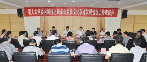 胥健主任通报了达州市人大常委会有关工作。他说,市人大常委会今年在推进文化大发展大繁荣方面做了三件事,一是开展了全市文化发展情况的视察调研工作;二是作出了《关于加快推进文化强市建设的决定》和《关于大力发展达州红色旅游的决定》;三是根据市委的安排,常委会主要领导联系了全国新农村文化艺术演展基地和凤凰山景区升级打造等重大项目建设工作。他针对公益性文化事业发展中存在的一些难题,向省人大提出了四条立法建议。一要进一步完善机制建设,对革命老区、贫困地区应加大政策扶植力度和资金投入,要建立城乡一体化的公共文化服务网络体系,使广大群众能共享文化发展和繁荣的成果;二要加大人才队伍建设,着重培养和扶持文化艺术方面的领军人物,建立激励机制,切实鼓励和扶持高雅艺术、精品力作、优秀传统文化的创作;三要有效保护非物质文化遗产和扶持地方文艺团体,不能把演出团体全部推向市场,否则会遏制优秀文化的传承和舞台艺术的繁荣;四要在房地产开发建设中,强制设置公益性文化阵地的规划。这些问题希望能从立法的角度加以解决。