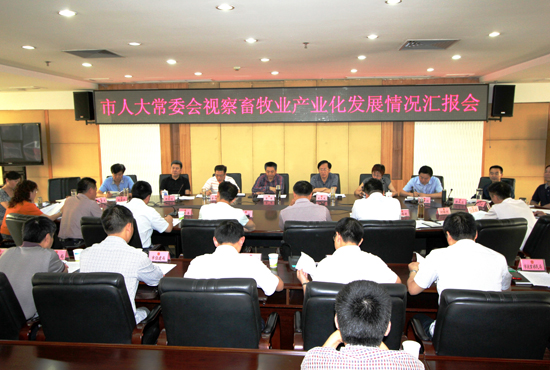 为推进我市畜牧业产业化发展,市人大常委会对我市畜牧业产业化发展情况进行了视察。6月17日,市人大常委会召开视察畜牧业产业化发展情况汇报会,市人大常委会主任胥健出席会议并讲话,常委会副主任刘元成、李绍奇、张德珍、邹惠明、王新权和秘书长陈绪科等出席会议,听取了市政府副市长徐承和市级有关部门的情况汇报。