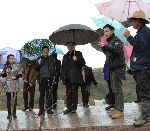 好雨知时节,当春乃发生。胥健一行冒着蒙蒙细雨,径直来到位于山麓的金蝉村2组新近建立的“金地湾”特色种养殖示范基地,实地调研指导基地产业发展。示范基地背靠大青山,区域内空气清新、环境秀美,常年有充足日照和水源,较宜发展种养殖。2015年,随着3.5km通组公路和配套水利设施的建成,以及数字电视户户通计划任务的完成,当地生产生活条件得到了很大的改善,特别是为产业发展奠定了坚实基础。2016年,在市人大等各帮扶部门(单位)的大力帮扶下,通过乡村两级和驻村工作组对扶贫政策的细致宣传和耐心讲解,在去年种植核桃、柑橘等基础上,金蝉村2组群众决心响应党和政府号召,“背靠”扶贫政策资金投入,以“建档立卡贫困户+非建档立卡贫困户”出地投劳成立合作社的方式,建立起了“金地湾”特色种养殖示范基地,进一步扩大产业规模、锻造品质品牌,从而实现抱团发展增收。