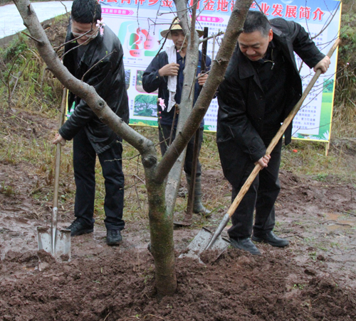 在村组干部和驻村工作组帮助下,“金地湾”特色种养殖基地不仅引进了品质优良、见效期短的特色水果,村民还抓住春耕春种有利时机迅速栽种了首批近30亩桃、李、梨果苗,部分已开出花朵,今年可挂果、明年即见效。胥健了解到这些情况后十分高兴,随即与各部门单位负责人一起栽种了几株桃树苗。胥健还在现场同基地农民亲切交谈,询问他们是否具备种树经验和后期管理经营的打算。听到村民介绍大部分人都有栽种柑橘的经验并将继续整理周边土地、投入家庭主要劳动力,胥健在表示肯定的同时也强调对经果林一定要“三分栽、七分管”,嘱咐种植户要持续投入力量精心管护,并要求各级农业部门要主动服务,加强技术指导,一定要把好事办实、办好,充分发挥基地示范效应,真正带动全村百姓脱贫致富。