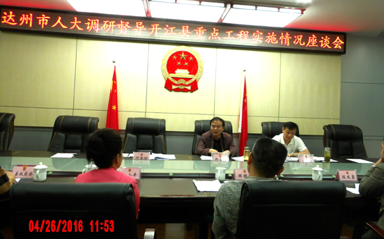 4月26日,市人大常委会党组副书记、副主任郑友清率市人大财经委负责人深入开江县调研督导重点工程项目建设情况。郑友清一行先后深入开江工业集中区基础设施建设工程、工业集中区产业项目、农建综合示范区、棚户区改造和省道S201开江县城至灵岩乡改造工程等重点工程项目现场实地调研,询问项目规划方案、施工建设进度、项目产出效能以及项目实施中存在的问题和困难,督促相关部门和项目业主加快进度,按时完成2016年项目投资计划任务。