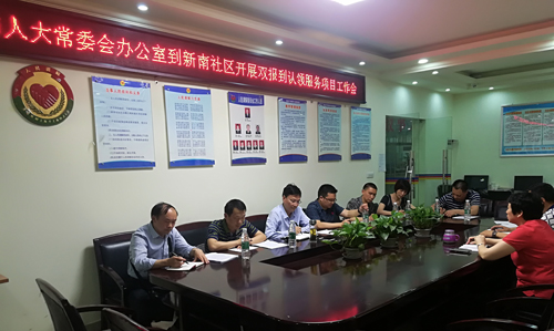 秘书长向守宇在听取社区的介绍后强调:一是领导高度重视,自“双报到”活动启动以来,市人大常委会机关高度重视,常委会主任胥健组织召开会议对此项工作进行了专题研究,要求机关各党支部和全体党员干部职工要清醒认识开展“双报到”活动的重要意义,要及时到社区报到认领服务项目,要积极主动参与,充分发挥党组织和在职党员在服务社区、服务群众中的战斗堡垒作用和先锋模范作用,提高机关党组织和党员深入群众、服务群众的能力;机关党委也组织召开了动员会,对此项工作进行了安排部署。二是机关党组织针对社区目前存在的困难认领服务项目,切实帮助社区解决实际问题,比如阵地建设问题,协调人民银行争取得到继续支持;消防设施建设问题,协调消防支队和市水务集团帮助解决;社区路口路面油化问题,协调区委、区住建局逐步推进;停车难、乱停乱放问题,与市交警支队、缓堵保畅办衔接共同推进;周边线路乱象整治问题,先与区委、区政府沟通,逐步解决。三是5月中旬前召集相关职能部门进行现场办公,切实帮助社区解决目前急需解决的问题。会上,机关党委与社区签订了服务项目认领协议书,机关各党支部提交了机关党员的“双报到”服务登记表。