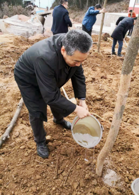 在柏树坪易地扶贫搬迁集中点,一排排整齐的楼房和宽阔的广场,都融入红色文化元素,红色第一村建设初见成效。胥健主任指出,要进一步完善配套工程,让入住群众过上幸福生活。随后,胥健主任一行在广场边栽种了香樟村,祝福番坝村早日脱贫奔康。
