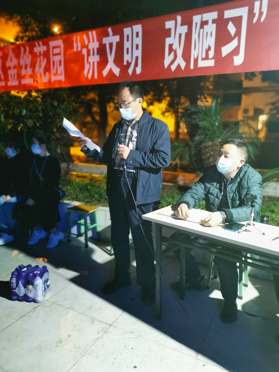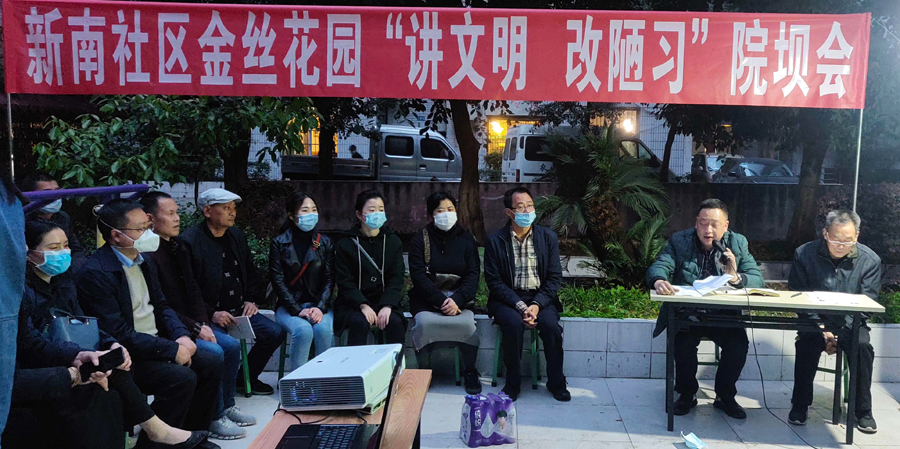 4月1日晚7点,达川区翠屏街道新南社区在金丝花园小区围绕“讲文明、改陋习”召开了一场别开生面的院坝会,市人大社会委董智文和信息中心罗欢同志应邀参加。