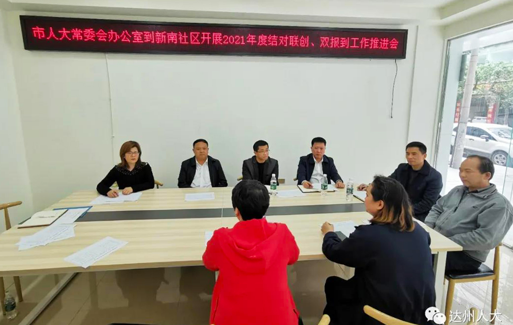 4月12日下午,市人大常委会办公室到结对联创社区——达川区翠屏街道新南社区召开2021年度结对联创、双报到工作推进会,常委会秘书长王成,副秘书长、办公室主任朱涛,副秘书长侯大斌,机关党委相关同志参加会议。