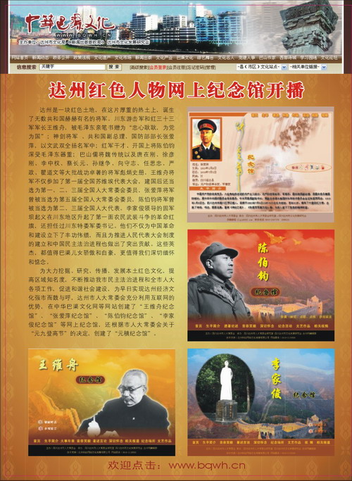为大力挖掘、研究、传播、发展本土红色文化,提高区域知名度,不断推动我市民主法治进程和全市人大各项工作,促进和谐社会建设,为早日实现达州经济文化强市而鼓与呼,达州市人大常委会充分利用互联网的优势,在《达州人大》、《中华巴渠文化》等网站创建了“王维舟纪念馆”、“张爱萍纪念馆”、“陈伯钧纪念馆”、“李家俊纪念馆”等网上纪念馆,还根据市人大常委会关于“元九登高节”的决定,创建了“元稹纪念馆”。