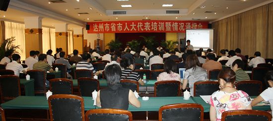 [本站讯 唐洪丽/报道 摄影/龚兢业] 7月29日,达州市人大常委会在莲花湖宾馆举办第四次省、市人大代表培训暨首次情况通报会。以会议形式向代表通报工作情况,是市人大常委会贯彻科学发展观,改进代表工作的新举措。市人大常委会副主任严选、刘元成,秘书长陈绪科,常委会委员范佳琼、钟少华、廖中樑、刘德伟、郑华祥,副秘书长文昌谦,人代工委主任廖小丹,市直机关和7个县(市、区)的省、市人大代表,各代表团代表小组长,各县(市、区)人大分管人事代表工作的副主任及人代工委主任80余人参加了会议。